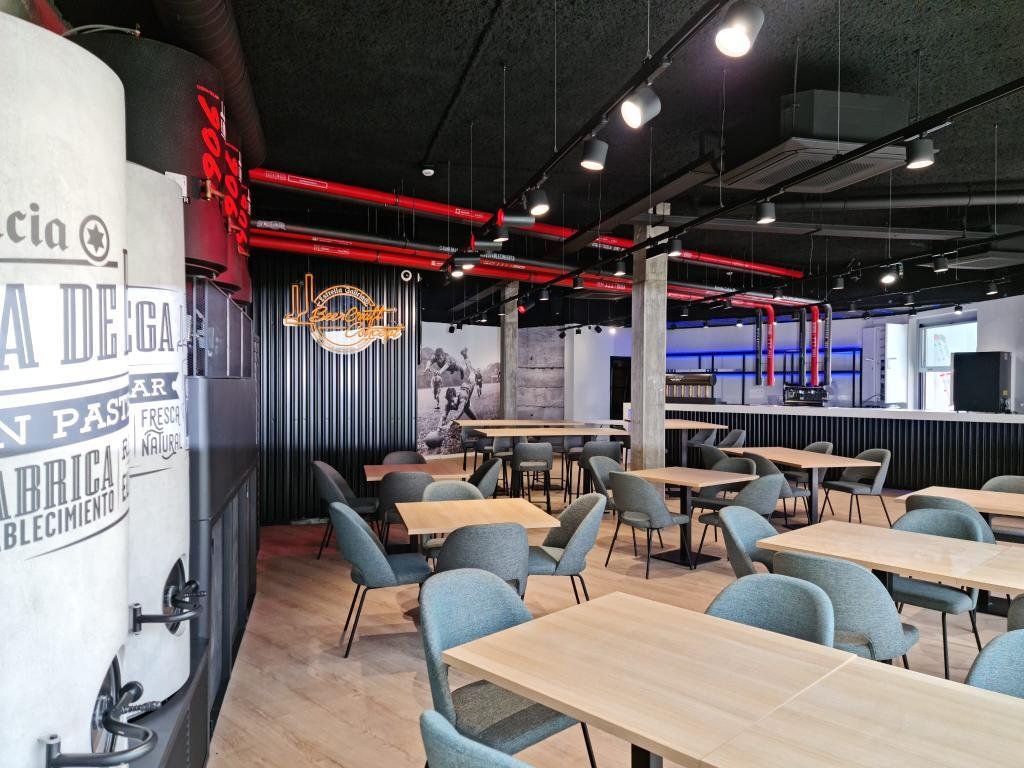 En la planta baja se encuentra la cervecería y en la planta de arriba el restaurante.