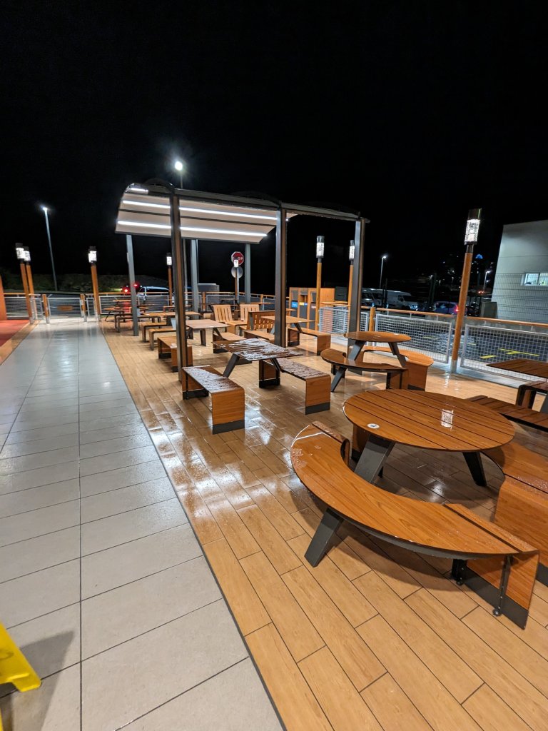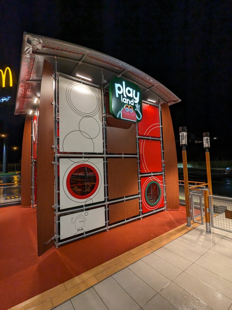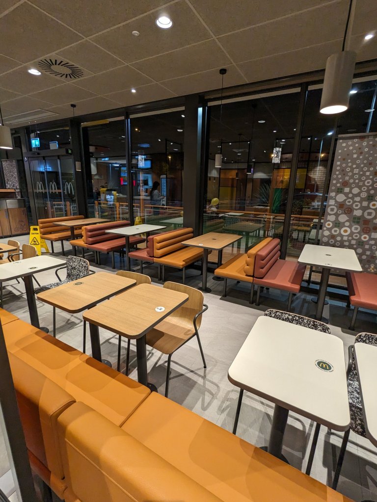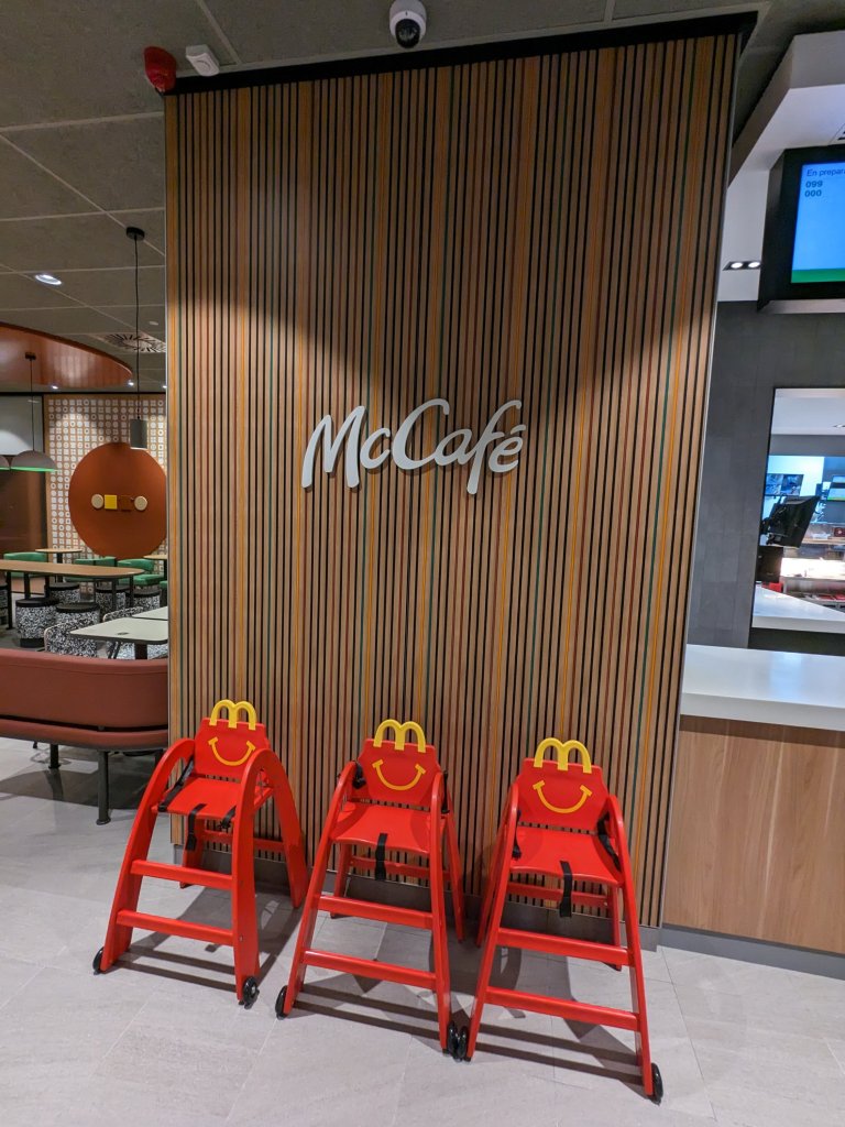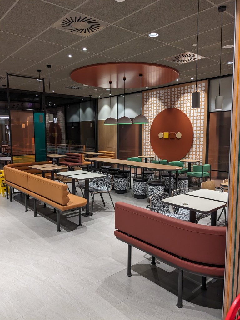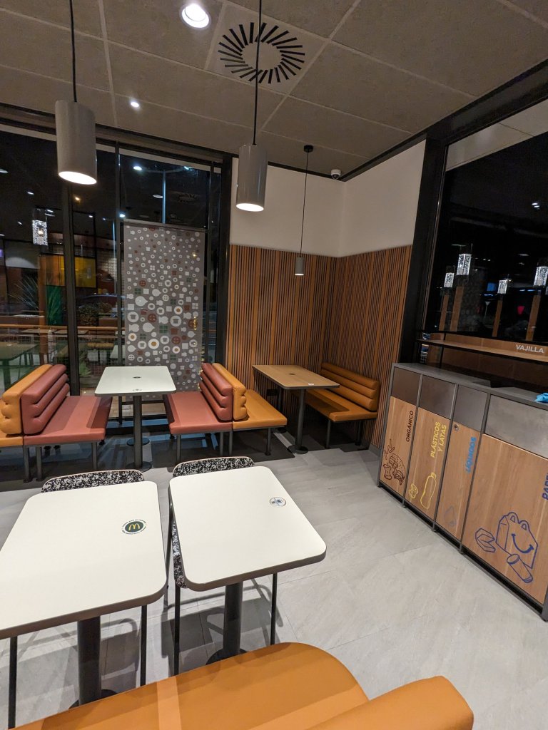 Tienen 300 metros cuadrados divididos en sala y terraza. Cuenta con kioscos digitales, servicio a mesa, McCafé, McAuto y zona de juegos en el exterior.