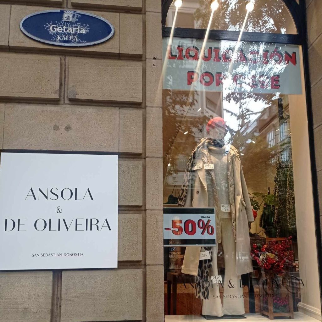 La tienda de moda Ansola y De Oliveira anuncia liquidación por cierre en la calle Getaria en el centro de Donostia.